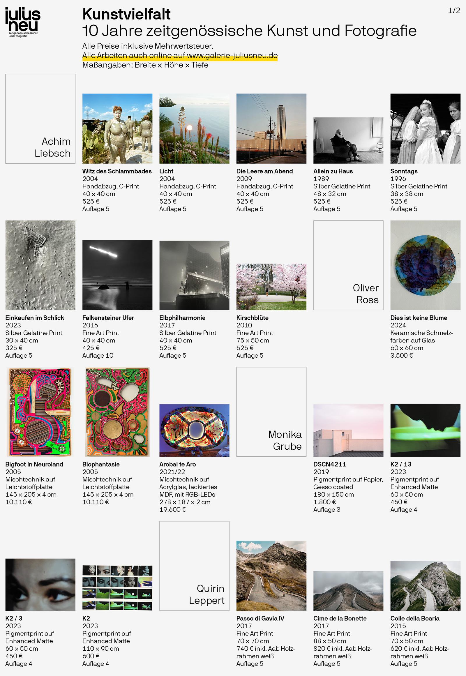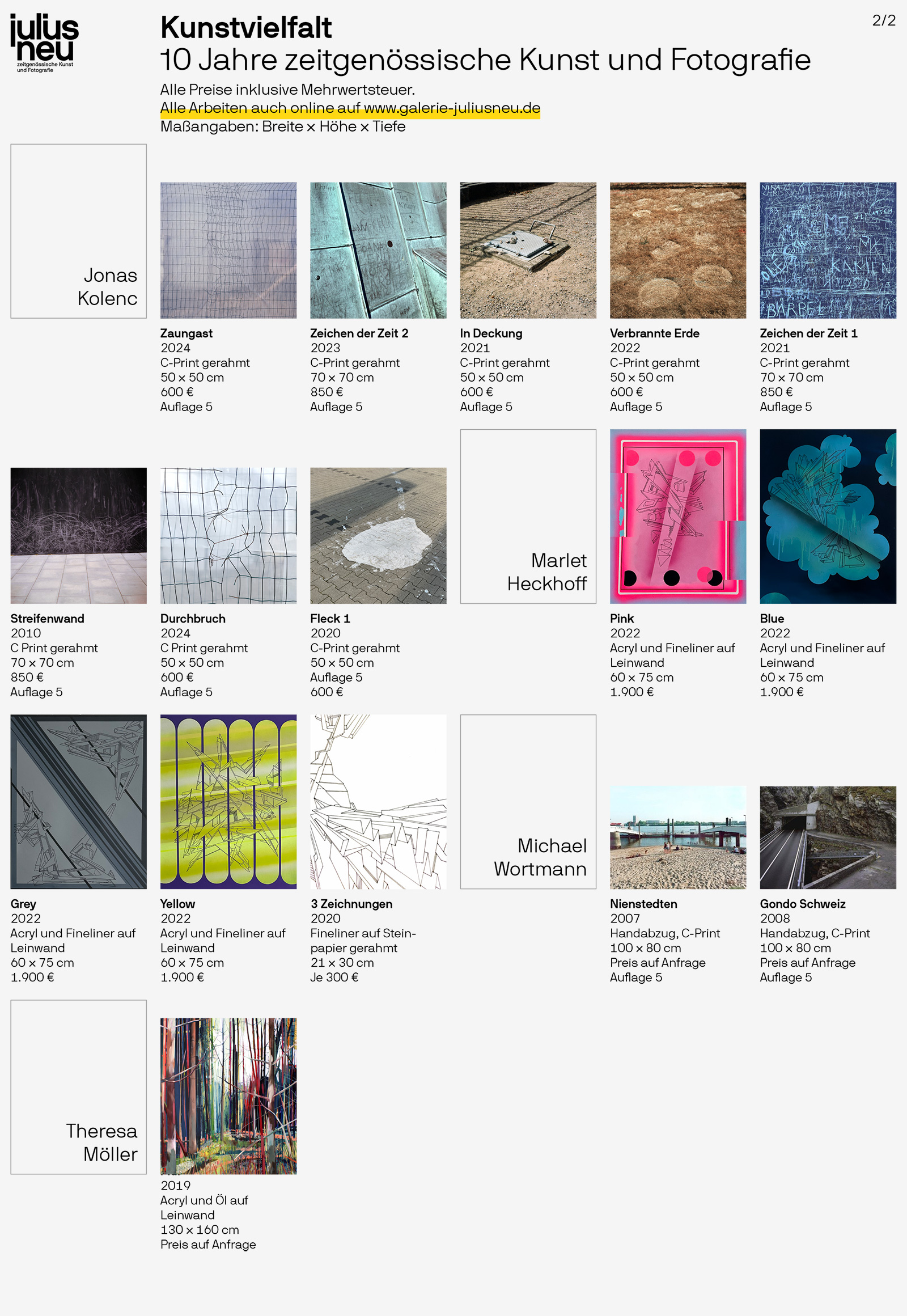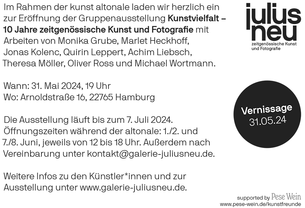 Im Rahmen der kunst altonale präsentieren wir unter dem Motto "Kunstvielfalt – 10 Jahre zeitgenössische Kunst und Fotografie" unsere erste Gruppenausstellung mit Werken von Monika Grube, Marlet Heckhoff, Jonas Kolenc, Quirin Leppert, Achim Liebsch, Theresa Möller, Oliver Ross und Michael Wortmann.